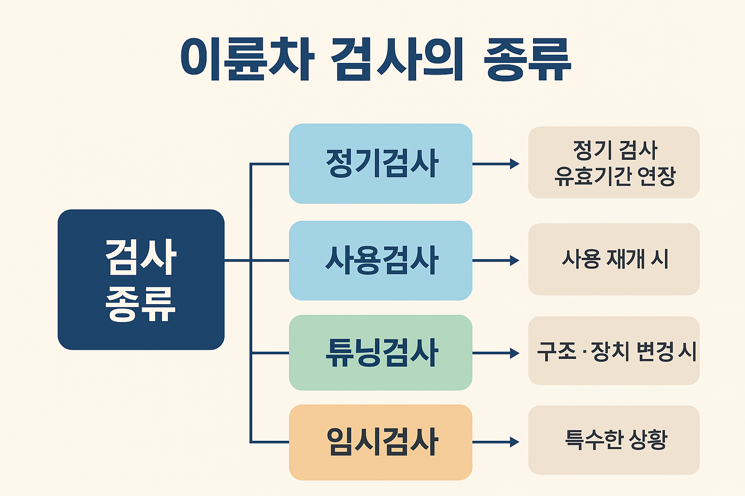 | 4단계: 구조 변경(튜닝) 시 | 머플러, 등화류, 제동장치 등 구조 변경 발생 | 튜닝검사 | 변경 사항이 법적 기준 충족 여부 확인 | 변경 후 즉시 | 승인받은 항목만 가능 |