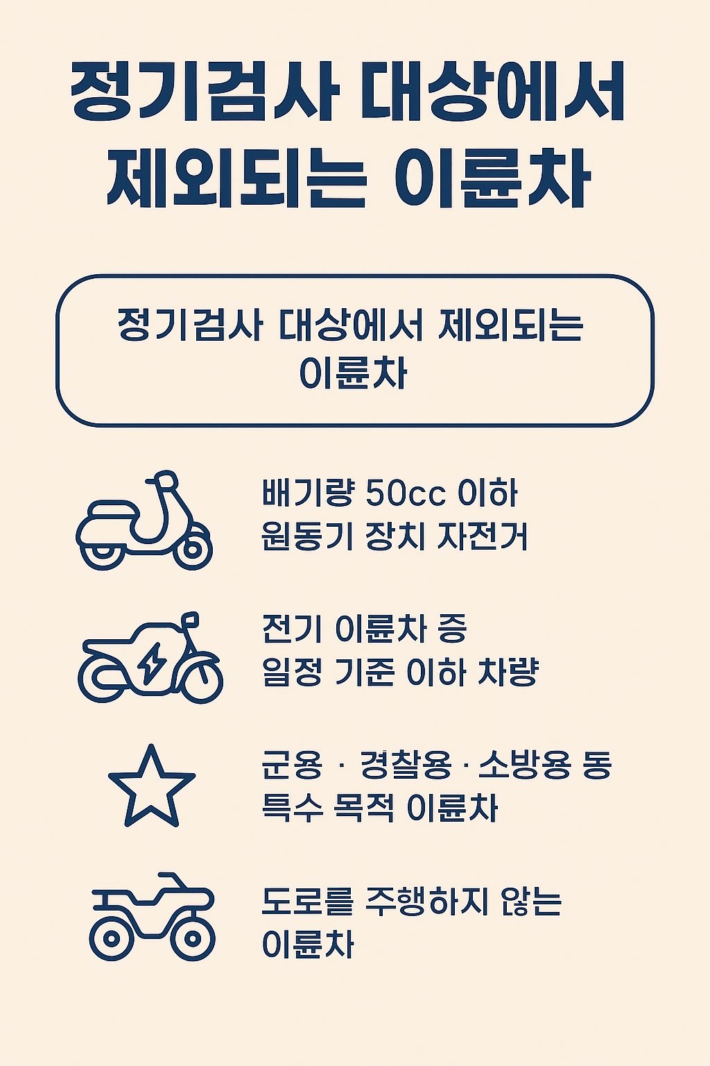 - 등록 차량 주의: 등록된 차량은 대부분 검사 대상이므로, 소유 이륜차가 예외 조건에 해당하는지 반드시 확인 필요